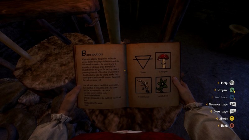 アイブライトを磨くことから始めます。アイブライトとベラドンナを大釜に入れます。ハーブを3ターン煮ます。ケイブマッシュルームを加えて蒸留する。
