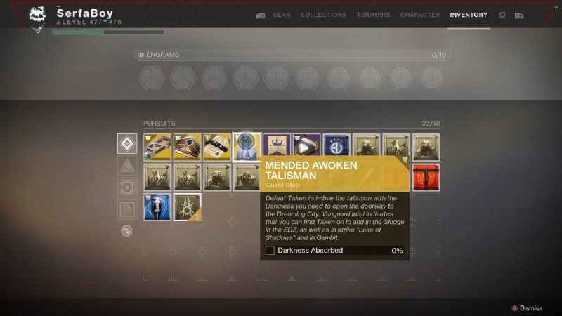 「夢見る都市への扉を開くために必要な闇をタリスマンに染み込ませるためにテイクンを倒せ。バンガードの情報によると、テイクンはイオのイオと EDZ のスラッジ、ストライクの「影の湖」とギャンビットで見つけることができます。