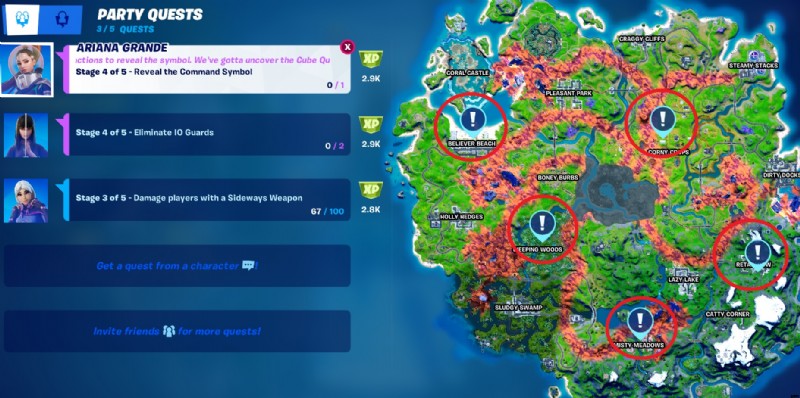 アリアナ グランデのパンチカード クエストの一環として、Fortnite でコマンド シグナルを明らかにするための最初のステップは、マークされた場所の 1 つに向かうことです (上の地図画像に示されているように)。 .