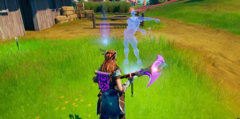 これらのポールに近づくと、ホログラムが表示され、実行する必要があるアクションが通知されます。最初のポールでは、つるはしを使ってポールを叩くアクションが示されています。