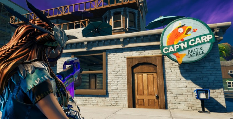 ビリーバー ビーチの桟橋に沿ってアリアナ グランデの NPC と話した後、Cap'N Carp Bait &Tackle の看板がある建物に向かってまっすぐ進みます (上の画像を参照)。 ).