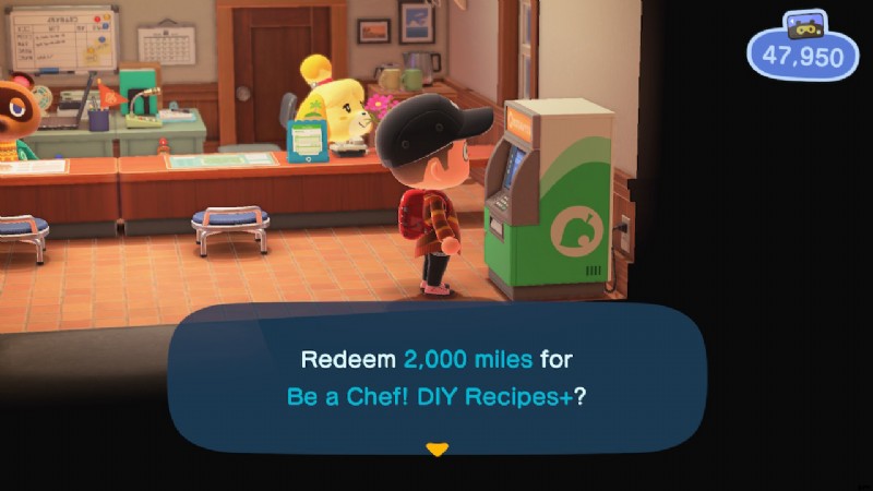 まず、料理をするために、居住者サービスの建物に向かい、ATM に行く必要があります。ここで「Redeem Nook Miles」をクリックし、下にスクロールして「Be a Chef!」を見つけます。 DIYレシピ+」のアイテムです。これを 2,000 ヌーク マイルで購入してください。