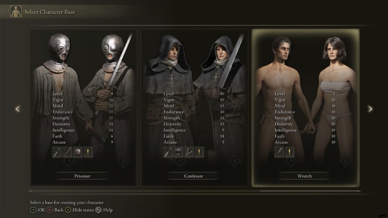 それがレッチがどのようなものかを示すものである場合、あなたは裸で始めます。 Wretch を選択した場合、レベル 1 でアーマーなしで開始し、武器用の棍棒を使用します。かなり生意気な取引のように思えますが、自分で課した難易度のプレイヤーだけが参加するものです.ただし、落とし穴があります。 Wretch はすべてのステータスが 10 の状態で開始します。レベル 1 ですべてが 10 になるということは、このクラスを作成するための自由裁量があることを意味します。最初は非常に無防備ですが、やり始めたら Elden Ring を実際に使用できます。