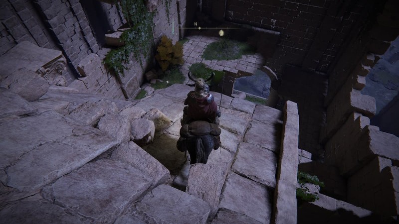 水道橋の下のスロープを降りて、レベルを下げます。最後まで左に進み、再び降ります。通路の傾斜した壊れた部分は、下の建物に飛び降りる方法を提供します。