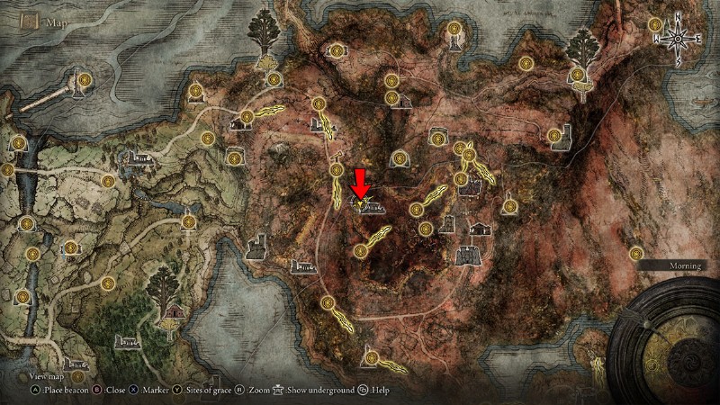 Rock Sling は Caelid の Sages Ruins の通りで見つけることができます。そこはエオニア沼のはずれにあり、危険地帯です。地面が血のように赤い水に沈んでいて、あなたを緋色の腐敗に陥れるだけでなく、ここには敵がいて、着弾時にあなたを毒する呪文を唱えます。