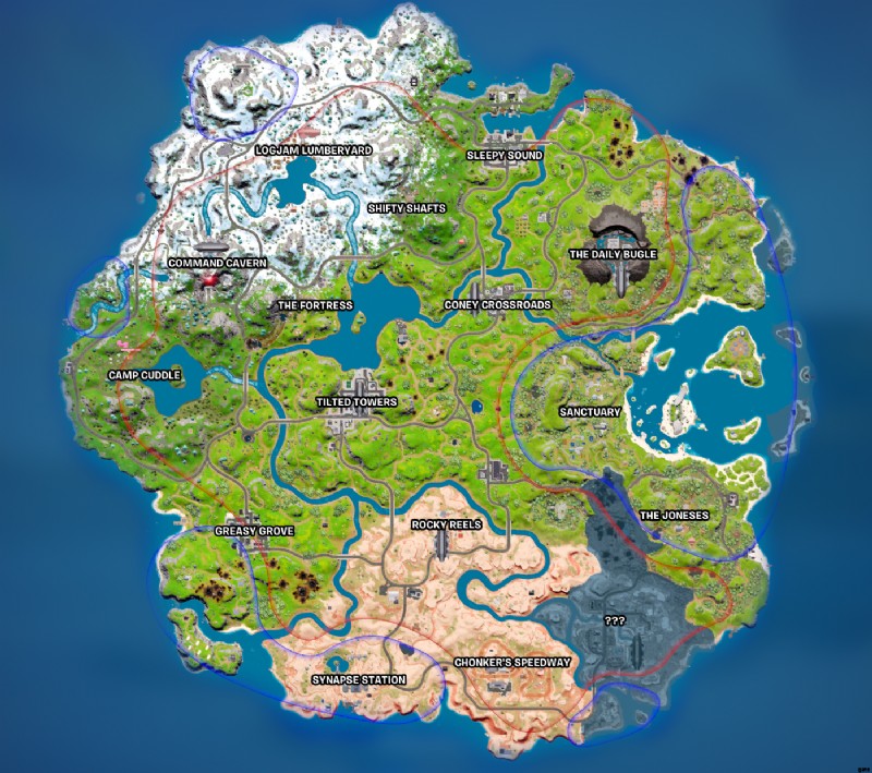 Fortnite Chapter 3 Season 2が登場し、ゲーム内のマップに興味深い変更が加えられました.目利きのプレイヤーは、マップ上にさまざまな領域があり、青い輪郭の領域と太い赤い線の領域があることに気付くでしょう。