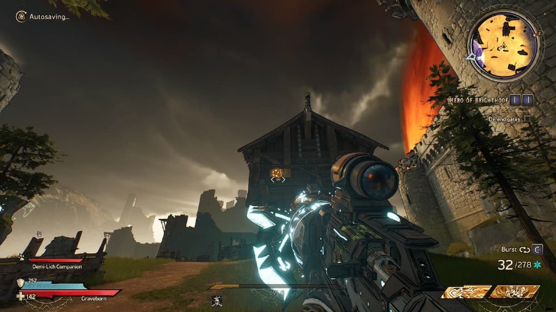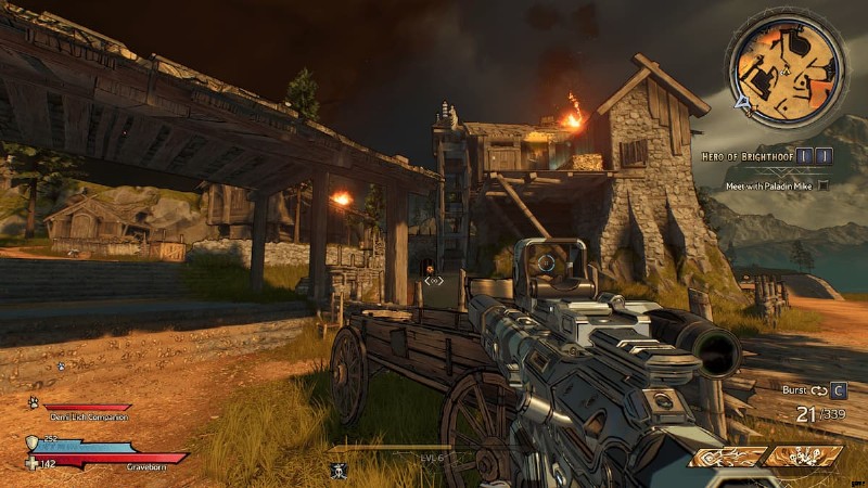 パラディンに到達してゲートを爆破すると、2 つ目のラッキー ダイスが見つかります。次のエリアに向かうと、右側に燃えている 2 階建ての建物が見えます。バルコニーでは、次に狙っているサイコロを見ることができます。