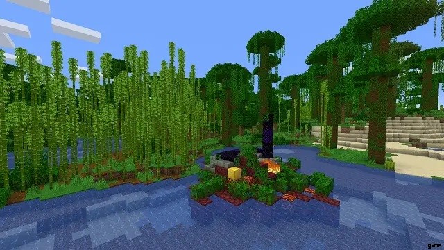 次は、もう少しシンプルな設定です。川と竹林がある大きなジャングルです。さらに、ポータルの遺跡はその森の中にあるため、これら 2 つを組み合わせてプレイしたい場合は、ジャングルの経験をネザーの世界に簡単に移すことができます。ポータルの場所については、以下を参照してください。