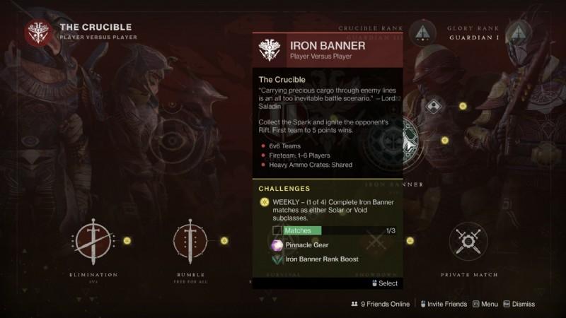 1 つ目は、Void または Solar サブクラスとして Iron Banner のマッチをプレイする必要があります。金曜日までにこれらの 4 つを完了することができます。週末までにそれらのいずれも行っていない場合は、すべてのロックが解除され、一気に行うことができます。これにより、プレーヤーは、その週にプレーできない場合でも追いつく機会を得ることができます。