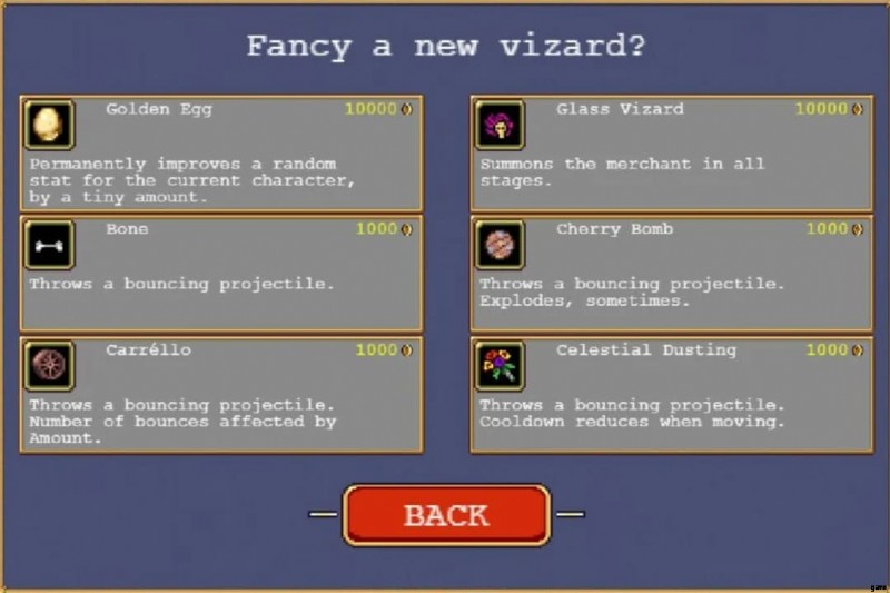 初めてマーチャントを訪れた後は、彼からグラス ウィザードを購入することをお勧めします。一度購入できるアイテムで、Vampire Survivors のすべてのマップで商人のロックを解除します。