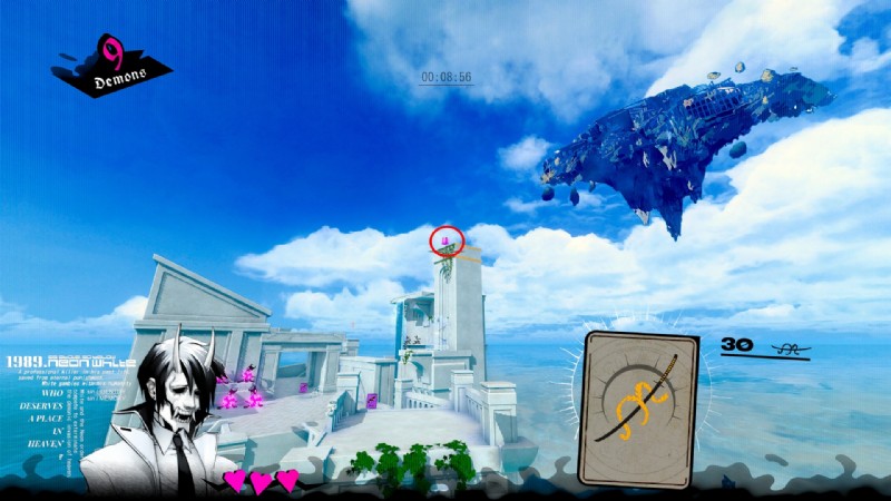 このレベルでは、3 枚の浄化カードをすべて集める必要があります。最初の2つをつかみ、黒い風船の悪魔を最上階まで跳ね上げます.ここから 3 枚目の浄化カードを手に取り、左側の屋上の建物に向かいます。非常に高い柱の上にギフトが見えます。爆弾を使用して、そこに跳ね返ります。完全な高さを得るには、柱に爆弾を取り付ける必要があります。