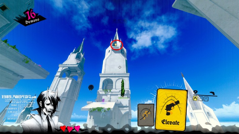 このギフトを手に入れるには、この画像の前にある棚に飛び乗り、Purify ガンを使用してその左側の棚に飛び乗るだけです。次に、黄色の敵を両方とも倒して、2 枚の昇格カードを手に入れます。ギフトの真向かいの屋上に飛び乗ってください。両方の昇格カードを使用してギャップをクリアすると、ギフトに直接着地する必要があります.