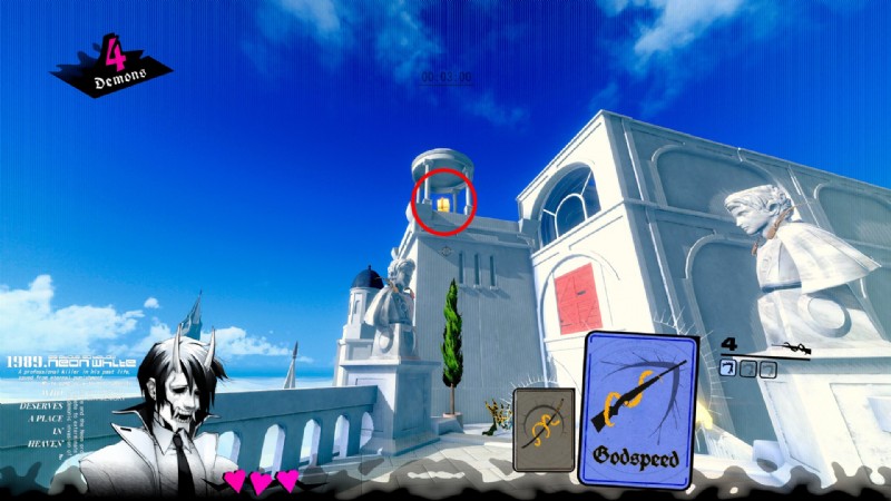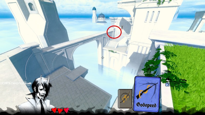 これについては、青い敵をすべて撃って(ダッシュではない)敵を一掃し、ゴッドスピードカードを3枚入手する必要があります.これはレベルの最初の段階です。 3 つになったら、2 番目のアーチから小さなリップにジャンプします。ギフトのある建物に最も近い唇にいるときは、ジャンプして 3 つのダッシュすべての長さを使用します。建物の正面にある小さな棚をつかむことができます。次に、手すりを飛び越えて、ギフトをつかむことができます。