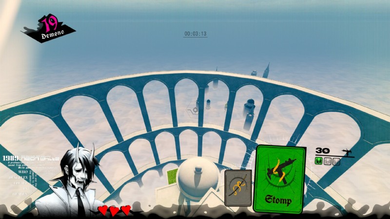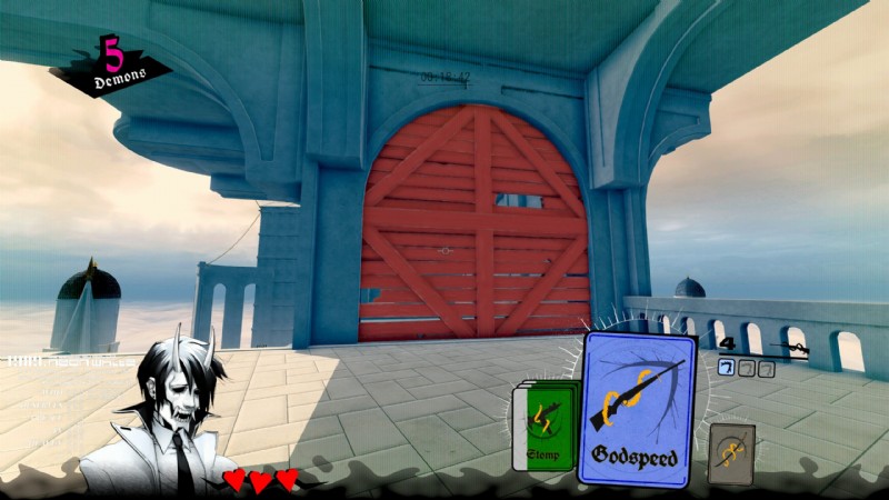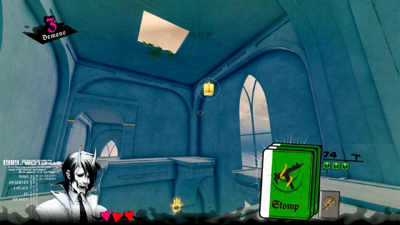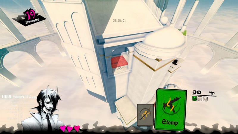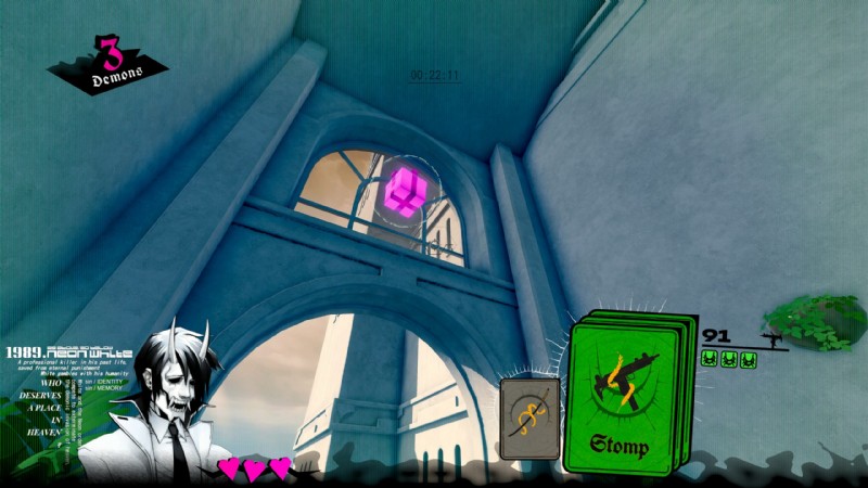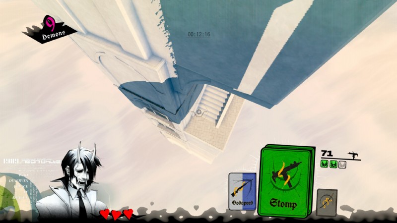 Descent の場合、レベルの開始時に角を曲がったところにいる敵を倒して Stomp カードを拾い、目の前の赤い壊れやすい床でそれを使用します。チェストを開いてGodspeedカードを手に取り、階段を上って外に出て、目の前の緑の敵を撃って別のStompを拾います.下のプラットフォームに倒れますが、ストンプカードは使用せず、敵を撃ち、3 枚目のストンプカードを拾います。振り向いて見下ろすと、あなたが入った建物の一番下に階段のケースが見えます. その建物に降りて、ゴッドスピードカードを使って壊れやすい赤い壁をダッシュしてから、3つのストンプすべてを使って.底に到達し、贈り物をつかみます。