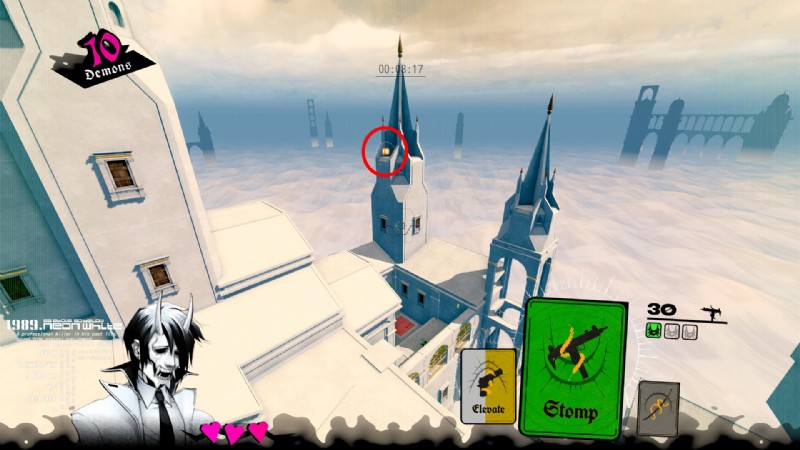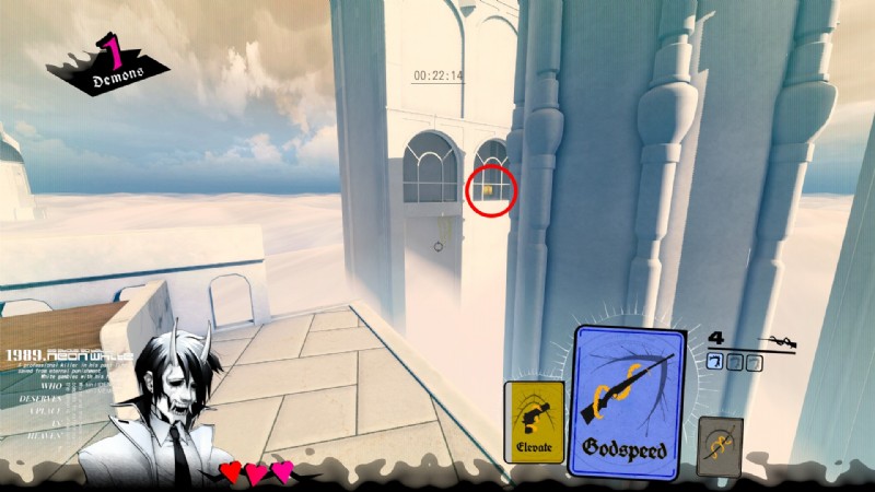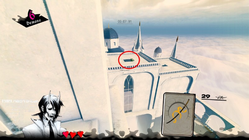 このギフトを受け取るには、通常どおりレベルを開始する必要がありますが、ロックオン レーザーで頭に到達したら、その周りを回ってその上の浄化カードをつかみます。 Elevate カードを燃やさないことが重要です。レーザーが発射されようとしているときは、安全を確保するためにいくつかの柱の後ろに隠れてください。 Purifyカードを手に入れたら、通常のルートには行かず、代わりに階段を下りてギフトの場所を見てください.目の前に棚が突き出ているのに気づくでしょう (赤い矢印) 爆弾が隙間を飛び越えてから、上昇カードを使用して傾斜した屋根に到達します。