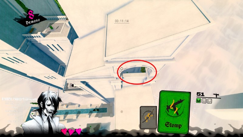 Stomp の場合、最初の赤いフェンスを突破したら、レベル全体をバイパスし、マップの左側にある大きな橋のような建物に向かって落下し始めます。あなたの目標は、上の丸で囲まれた棚に着陸することです。そこから浮かんで下にあるギフトをつかむことができます。