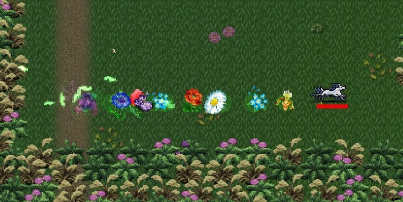 Celestial Dusting は、移動すると背後に花を咲かせます。これらのカラフルな花は、敵を貫通し、周囲の障害物や壁で跳ね返ります。キャラクターの持続時間の値 (デフォルトのキャラクター統計、パワーアップ メニューでの購入、拾ったパッシブ アイテムの影響を受ける) に応じて、キャラクターはゆっくりと停止し、花びらが爆発して大きなダメージを与えます。あなたが動いていない場合、花はあなたの下に留まりますが、武器は頻繁に動き回る際に使用するように作られているため、スポーンはますます少なくなります.