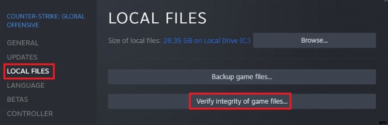 Steam ライブラリから、インストールされているゲームのリストにある Counter-Strike:Global Offensive を右クリックし、[プロパティ] をクリックします。そこからローカル ファイルに移動し、ゲーム ファイルの整合性を検証します。 .これは、一般的に機能する修正です。この関数は、ゲーム ファイルが正当でクリーンであるかどうかをチェックします。ファイルに問題がある場合やファイルが見つからない場合は、Steam が自動的にファイルを置き換えますので、このチェックが行われている間はリラックスしてください。