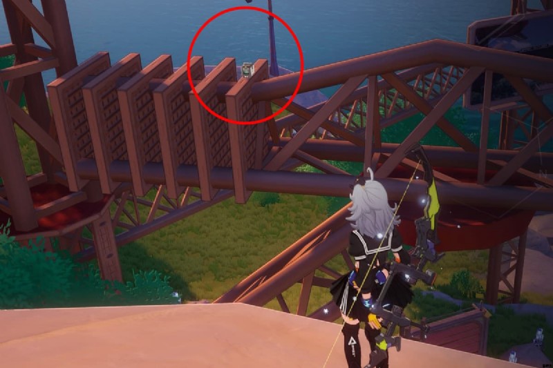 - バイ リンの避難所の建物の上に向かい、その北にある山に登ります。塔を東に見ると、接続している金属製の梁の上にボットがいます。ボットのプラットフォームに向かって飛行します。