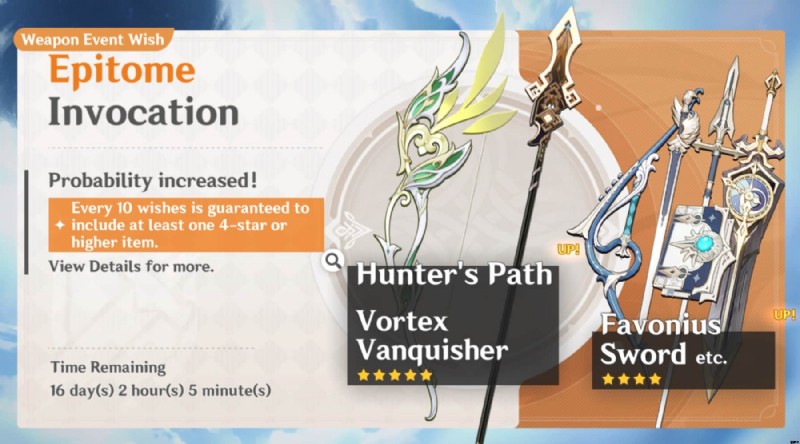 ハンターズ パス ボウは現在、現在のエピトーム インヴォケーション ウィッシュ バナー中に、イベント限定武器として利用できます。このバナーを使用すると、他の 5 つ星武器よりもハンターズ パスまたはボルテックス ヴァンキッシャーを獲得できる可能性が高くなります。ただし、この確率の増加にもかかわらず、まだ比較的低い確率です。