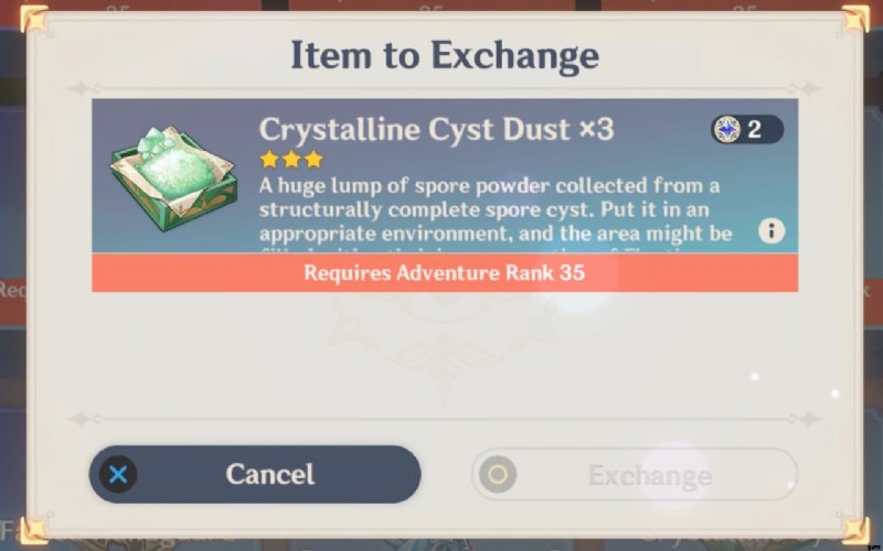 スターグリッター交換のパイモンズ バーゲンでは、スターグリッター 2 個でクリスタリン シスト ダスト 3 個を購入できるオプションがあります。 Fungiの敵を粉砕したくない場合、またはガチャの引きをもっと購入したくない場合は、ここでダストを購入することは実行可能ですが高価な方法です.