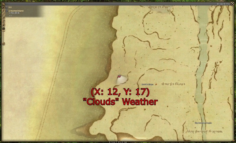 グランド バッファローは、「雲」の天気である限り、夜遅くも日中も歩き回っています。 現在アクティブです。ミニマップに添付されたアイコンにカーソルを合わせて天気を確認します。曇りの場合は、現在の時間に関係なく、グランド バッファローを見つけるチャンスがあります。 (X:12, Y:17) 座標付近の島の最西端に向かう より一般的な水牛の中で巨大な獣を見つけるために.
