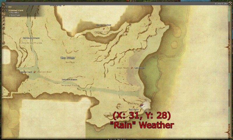 エオルゼアの特定の時間帯に関連するまれなスポーンもありますが、ゴールド バックのスポーンは島の天候に厳密に基づいています。獣を見つけるチャンスは、「雨」の天気まで待つ必要があります 、ミニマップに付いている小さなアイコンにカーソルを合わせると確認できます。 「雨」と「にわか雨」は2つの異なる天気パターンであるため、2つを混同しないでください.雨が降っている場合は、(X:31, Y:28) 座標に向かいます 島の南東の崖の周りにあり、カラフルな生き物が周りに立っているのが見えるはずです.