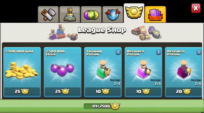 苦労して獲得したリーグメダルを使用して、村のショップで購入できます。金色のリーグ メダル アイコンがあるストアの 5 番目のタブを選択します。リーグ ショップ メニューの下に、一定数のリーグ メダルで購入できるさまざまな通貨とアイテムが表示されます。