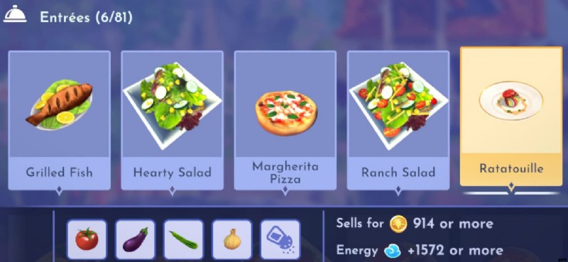 ラタトゥイユのレシピについてレミーに話すと、トマト、調理済みの野菜 3 つ、スパイス 1 つが必要だと教えてくれます。ただし、組み合わせによっては、ボリュームたっぷりのサラダや焼き野菜の盛り合わせなど、別の料理になることもあります。これを念頭に置いて、トマトとハーブと一緒に特定の材料を使用してレシピを完成させる必要があります.