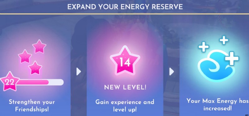 ゲーム内のさまざまなディズニーキャラクターとの友情をレベルアップして強化すると、エネルギーの蓄えが拡大します。この拡張は、最大エネルギーが増加することを意味し、エネルギーを再び補充する前により多くのアクションを一度に実行できるようになります。初期の段階では大きな違いはありませんが、レベルアップしてゲームを進めていくと、かなりの増加が見られるようになります。