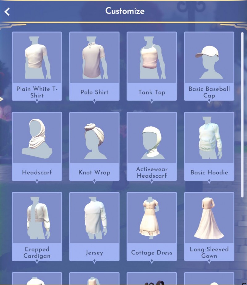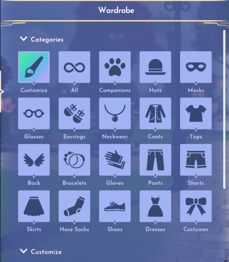 まず、インベントリを表示することで実行できるワードローブ メニューに入る必要があります。ここから、ワードローブのアイコンをクリックし、[カスタマイズ] タブをクリックします。そこから [作成] ボタンをクリックすると、さまざまな種類の服のオプションが表示されます。