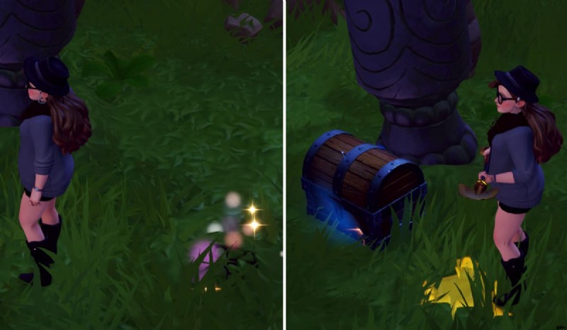 ロックされたチェストを見つけるには、神話の洞窟に向かってダズル ビーチに向かいます。石の柱の 1 つの近くにチェストを収容する発掘場所があります。このスペースを掘ってチェストを発掘し、それを拾ってこの冒険の後半に進むことができます。