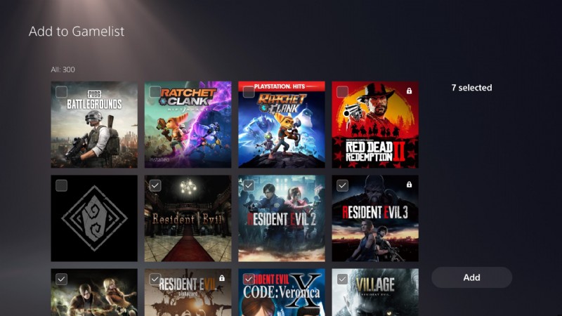 追加したいゲームのボックスをチェックすることで、新しいゲームリストにコンテンツを追加できます (最大 100 ゲームまで)。上記の例では、利用可能なバイオハザード コンテンツをすべて選択して、バイオハザードをテーマにしたゲームリストを作成します。ゲームの選択が完了したら、[追加] を選択して次のステップに進みます。