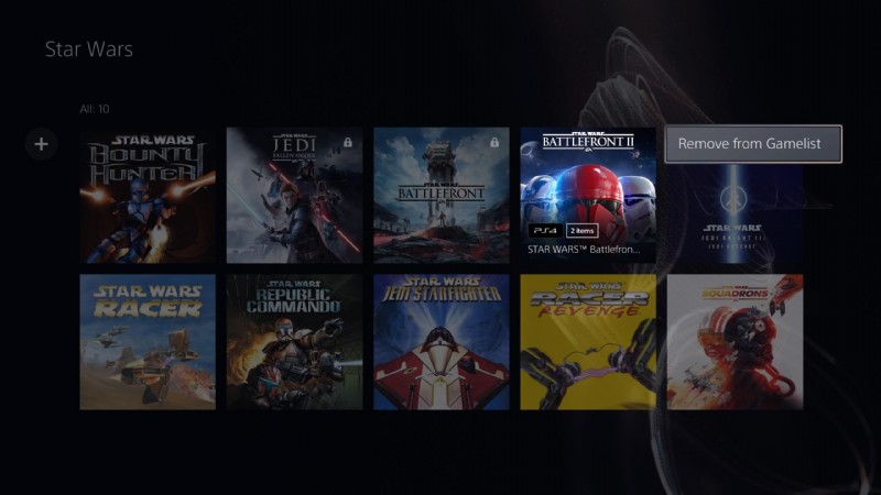 ゲームリストから特定のゲームを削除したい場合は、ゲーム ライブラリの [あなたのコレクション] タブに移動し、コンテンツを削除したいゲームリストに移動し、削除したいゲームを見つけてオプション ボタンを押します。コントローラー。 「ゲームリストから削除」を選択すると、ゲームリスト全体を削除せずにアイテムが削除されます。上記の例では、Star Wars ゲームリストから Star Wars バトルフロント II を削除しています。