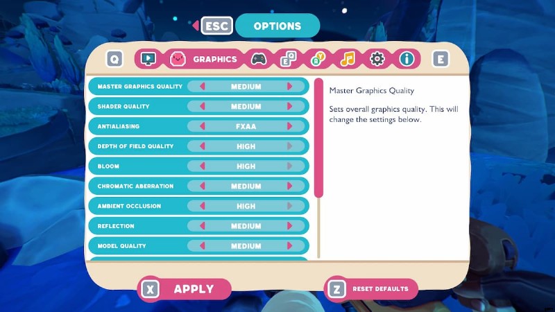 次に、Slime Rancher 2 でフレームレートをさらに向上させるには、ゲーム内の [設定] を開き、[グラフィック オプション] に移動します。 .選択肢のかなりのリストを含むメニューが表示されます: