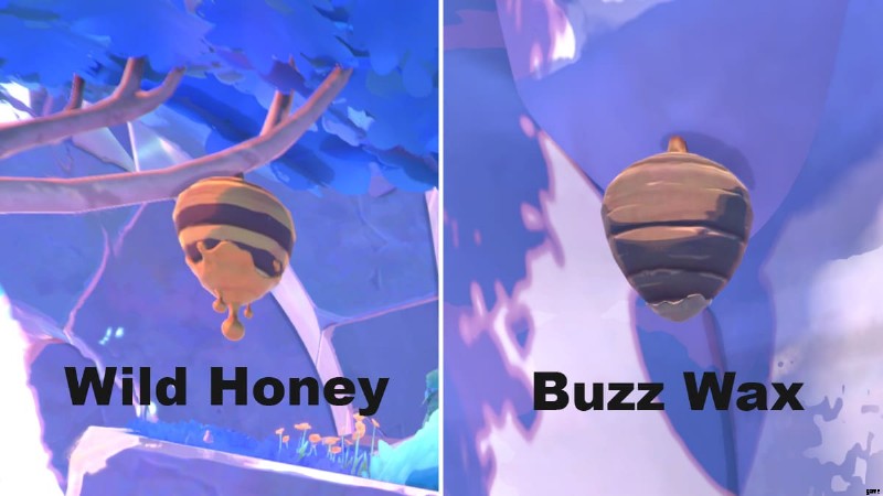 リソース ハーベスターを入手したら、スターライト ストランドの探索を開始できます。この地域に入ったら、茶色の蜂の巣に注意してください。少し遅れて蜂の巣を吸い取り、バズ ワックスを入手します。途中、野生の蜂蜜を含む黄色と黒の縞模様の蜂の巣に遭遇することもあります。 2つを混同しないように注意してください!両方のじんましんの違いを理解するには、下の図をご覧ください: