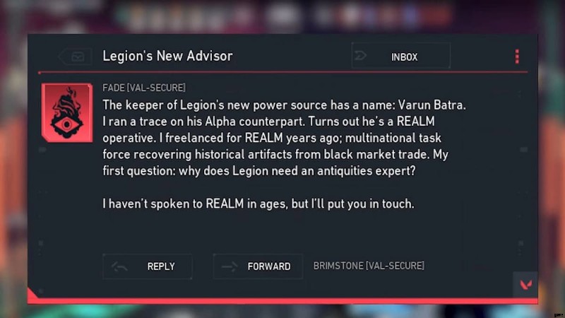 エージェント Fade と Brimstone の間のゲーム内メールで、Harbor の本名が Varun Batra であることを知りました。これは、ヒンズー教の海の神「Varuna」に言及している可能性があります。これは、ハーバーがインド出身で、ある種のウォーターベンダーであるという噂と一致しています.彼はまた、今まで Valorant の伝承で聞いたことのない機関である REALM の工作員でもあります。
