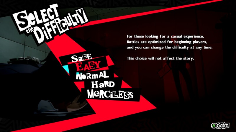 ゲームの設定によると、イージーは「カジュアルな体験を探している人向け。バトルは初心者向けに最適化されており、いつでも難易度を変更できます。」前述の女神転生の wiki ページによると、難易度セフティと同様に、プレイヤーは通常の敵から受けるダメージの半分しか受けず、敵に変更なし (1.0 倍) のダメージを与え、さらに 1.2 倍の経験値とお金を受け取ります。それぞれ。敵はまた、戦闘の合間にプレイヤーを簡単に追跡することができず、セキュリティレベルはより高い難易度ほど速く上昇しません.簡単に言うと、これは Safety からわずかにステップアップしたものですが、Persona 5 Royal に見られる他の困難よりもはるかに簡単です。