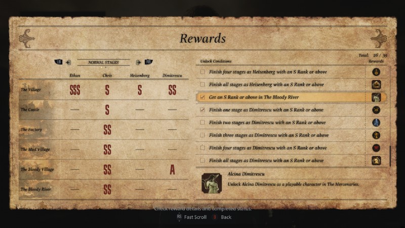 アルチーナ ディミトレスクを傭兵追加命令のキャラクターとしてアンロックするには、プレイヤーはウィンターズ エクスパンションの第 2 ステージであるブラッディ リバーで「S」ランク以上を達成する必要があります。ありがたいことに、ブラッディ リバー II ハード ステージで「S」ランクを達成することははるかに難しい偉業であるため、ブラッディ リバーの通常の難易度で「S」ランクを達成することによってレディ ディミトレスクのロックを解除できます。ブラッディ リバーは、ブラッディ ビレッジ ステージで「A」ランク以上を達成した場合にのみアクセスでき、そのステージは、傭兵の 4 つのベース ゲーム ステージで「A」ランク以上を達成することによってのみロックを解除できます。 The Mercenaries でこれらの高いランクを達成するには、プレイヤーはさまざまなマップに精通し、ロードアウトに使用する装備を理解し、長いコンボを維持し、できるだけ早くステージを終了する必要があります。