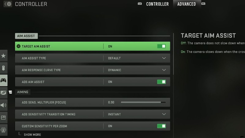 [設定] メニューで、[コントローラー] に移動し、[詳細設定] タブを選択します。ここには、コントローラーで使用できるすべてのエイム アシスト オプションがあります。オンとオフを切り替えることもできますが、追加の難易度を本当に感じたい場合を除き、使用しない理由はあまりありません.