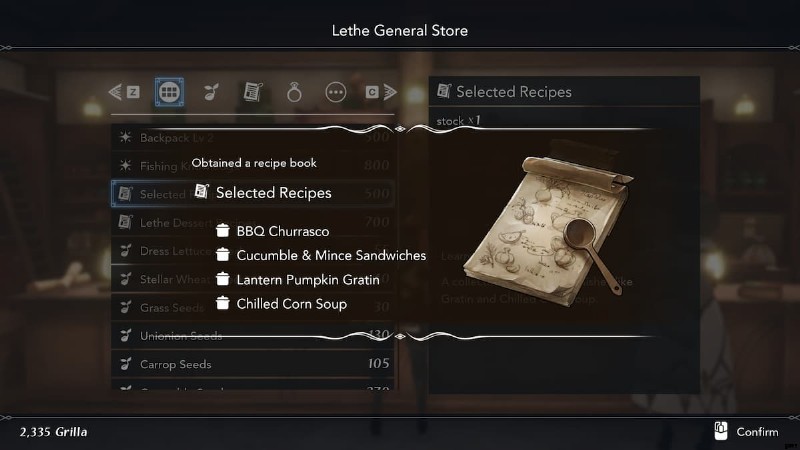 Harvestella で食事を準備する前に、まずそのレシピを取得する必要があります。 おすすめのレシピを購入すると、バーベキュー シュラスコのレシピがアンロックされます 500 グリラの小冊子 レテ村の雑貨屋から。