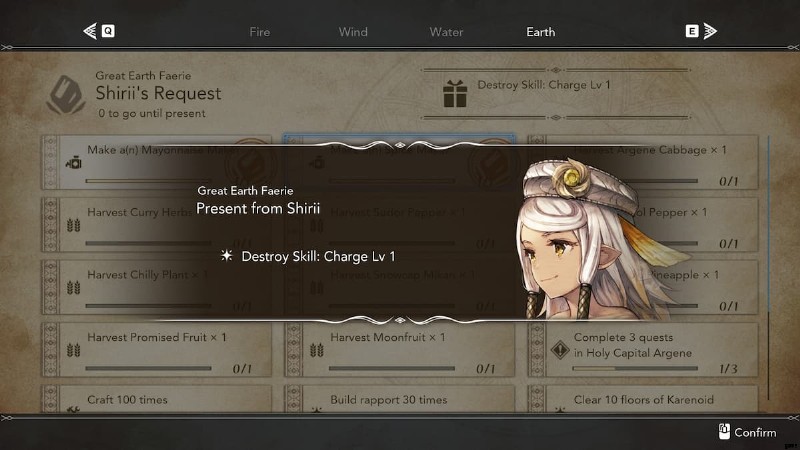 大地の妖精 は、デフォルトで Shirii という名前で、大きな岩を壊す方法を学ぶために探している人です。具体的には、デストロイ スキル:チャージ Lv 1 合計 6 つの妖精の命令を完了すると得られる報酬 シリイ出身。