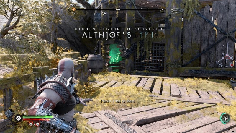 リグの最上部に到達して破壊したら、来た道を戻るのではなく、来た道から左側を見てください。Atreus が撃って破壊できる 2 つのバレルに気付くでしょう。今、彼らに近づき、フェンスの周りを登ります。道なりに進み、鎖を蹴り落とす。滑り降りて入り口に戻ります。最初に使用したコントロール ホイールを回転させますが、今回は可能な限り高く上げます。
