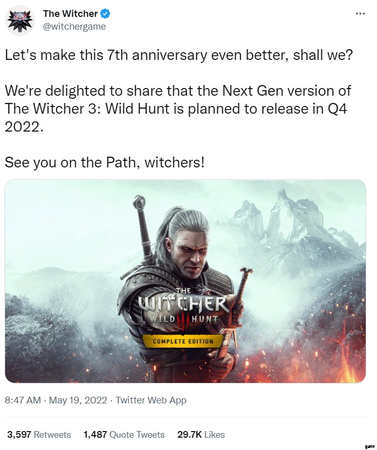 The Witcher 3:Wild Hunt の次世代リマスターが「無期限」に延期されるという以前の報告を受けて、2022 年 5 月 19 日の発売から 7 周年を記念して、公式の「The Witcher」Twitter アカウントは次のようにツイートしました。 7周年はもっといいじゃないですか。 The Witcher 3:Wild Hunt の次世代バージョンが 2022 年第 4 四半期にリリースされる予定であることをお知らせできることを嬉しく思います。パスでお会いしましょう、ウィッチャー!」