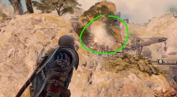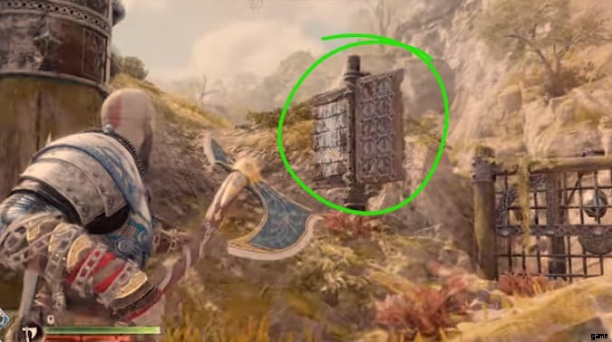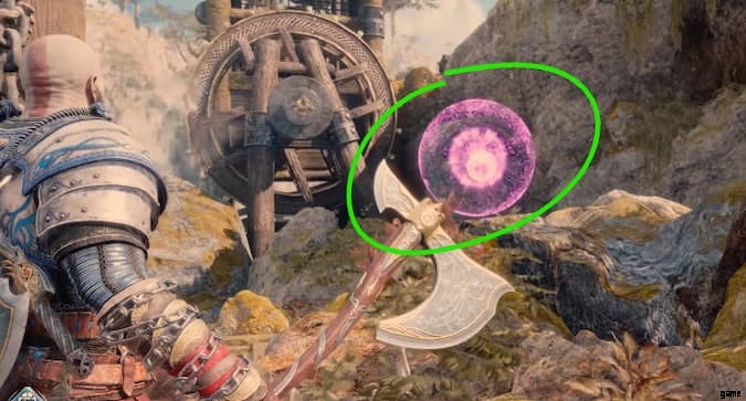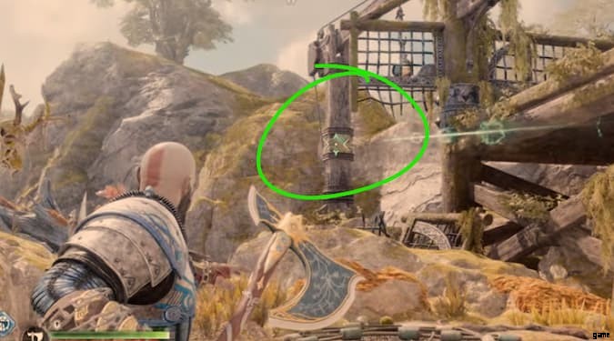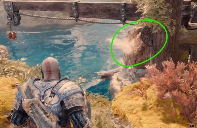 あなたがYggdrasil Riftを開いた板で作られた中央のプラットフォームに戻ります.水が車輪からこぼれる場所に向かって、最も遠い端に向かってください。水のカスケードの下に、槍用の別の噴気孔が見えるはずです.時間制ですので、お早めに。槍を投げて岩を破壊してください。