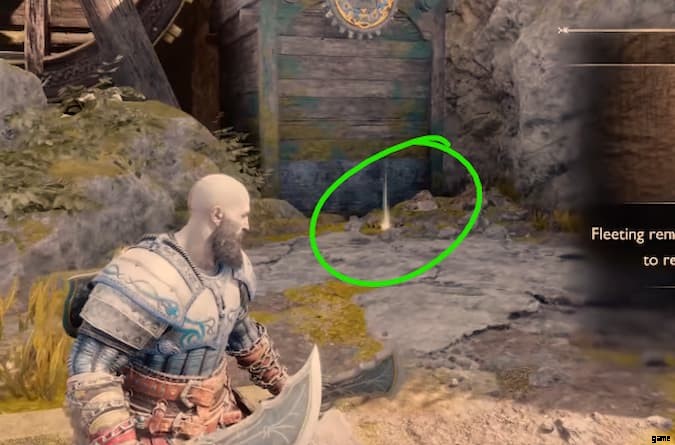岩壁に向かって少し右に曲がると、槍を詰まらせることができる場所を示す空気またはエネルギーの突風が見えます.それに近づき、ドラウプニルの槍を押し込みます。上昇すると、死体とその上にあるウェイファーラーの精神が見えます。クラトスは精神に厳しいニュースを伝えますが、アルベリヒ島には宝物があることがわかりました.