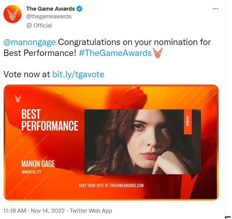 マノン・ゲージは、ビデオゲーム業界における新しい血の一例です。彼女は、Half Mermaid Productions のインタラクティブ フィルム ゲーム、Immority でのマリッサ マルセルとしての役割でノミネートされたため、現在、ビデオゲームの演技クレジットは 1 つしかありません。 The Game Awards の Best Performance に Gage がノミネートされたのはこれが初めてです。