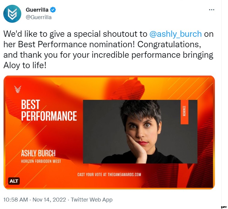 Ashly Burch はビデオゲームの声優のベテランで、2012 年に Awesomenauts でデビューして以来、数多くのプロジェクトで取り上げられてきました。 、ライフ イズ ストレンジのクロエ プライス、ホライゾン シリーズのアロイは、ホライゾン フォービドゥン ウエストでのパフォーマンスでノミネートされました。 2015年、2017年、2019年に続いて、バーチがザ・ゲーム・アワードにノミネートされるのは今回が4回目です。バーチがザ・ゲーム・アワードでベスト・パフォーマンス賞を受賞したのは4回目でしょうか?