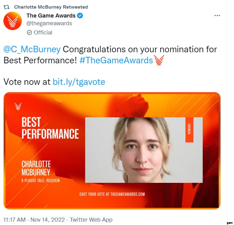 シャーロット・マクバーニーもザ・ゲーム・アワードの新顔であり、この記事の執筆時点で彼女の名前は合計 3 つの演技クレジットしかありません。マクバーニーは、疫病物語シリーズのプレイヤー キャラクター、Amicia de Rune として 2 度出演し、最初は疫病物語:イノセンスで主人公の声を出し、続編である疫病物語:レクイエムに戻ってきました。これは、マクバーニーがザ ゲーム アワードのベスト パフォーマンスにノミネートされた最初の作品です。