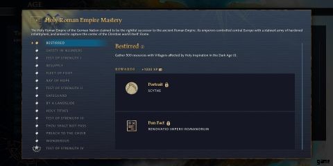 プレイヤーは、神聖ローマ帝国 (および他の文明) のために、マスタリーと呼ばれる一連の課題を完了することができます。それらを完了すると、プレイヤーは 1,000 経験値ポイントと、楽しい事実、肖像画などの形でさまざまな報酬を得ることができます。